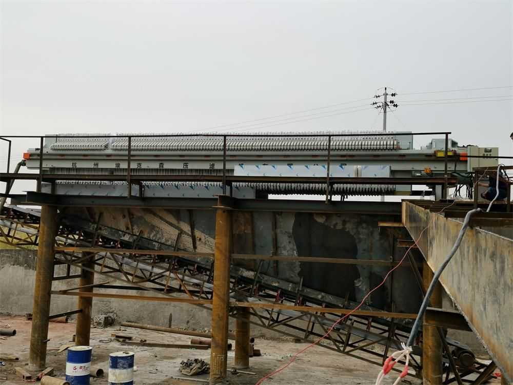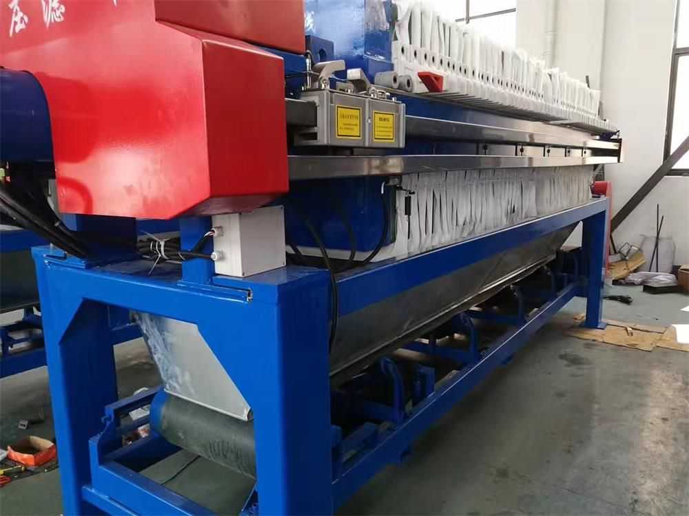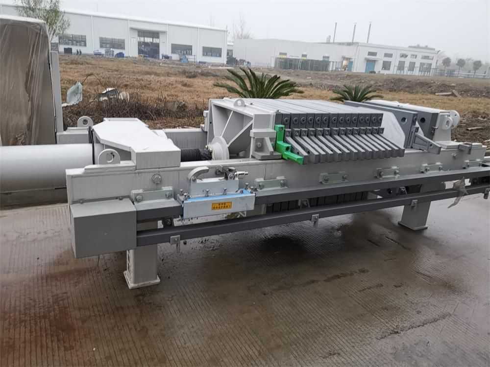 隔膜壓榨壓濾機是由隔膜板和廂式濾板排列組成濾室,在輸料泵的壓力作用下將料漿輸入濾室,通過過濾介質(zhì)(濾布)將料漿中的固體和液體分離,當(dāng)料漿中的固體形成餅后,再向隔膜通入空氣,對濾室內(nèi)的固體充分壓榨。